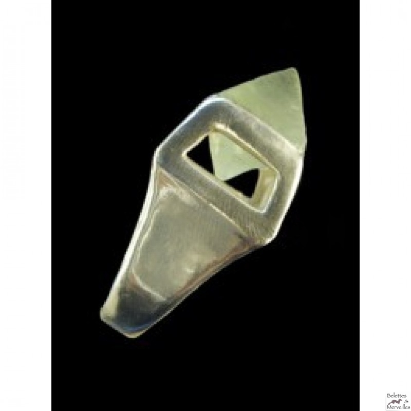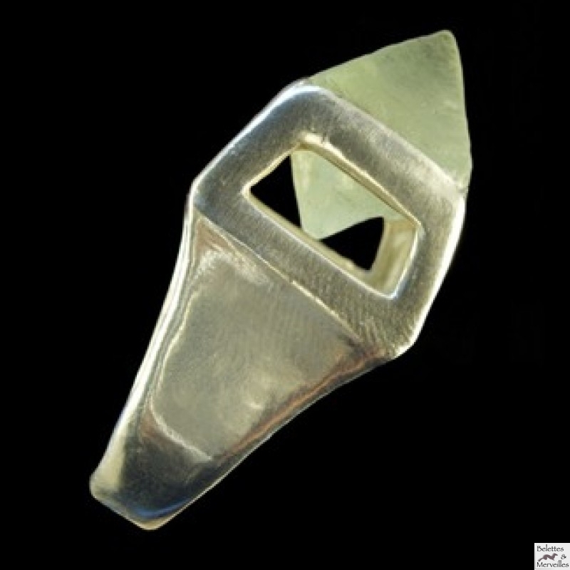Bague de taille 56, en argent. Une fluorite brute (22,74 carats) en sa forme naturelle d'octaèdre, 17 g d'argent. Cette bague est à traiter avec ménagement car la fluorite ne figure pas parmi les pierres les plus dures.