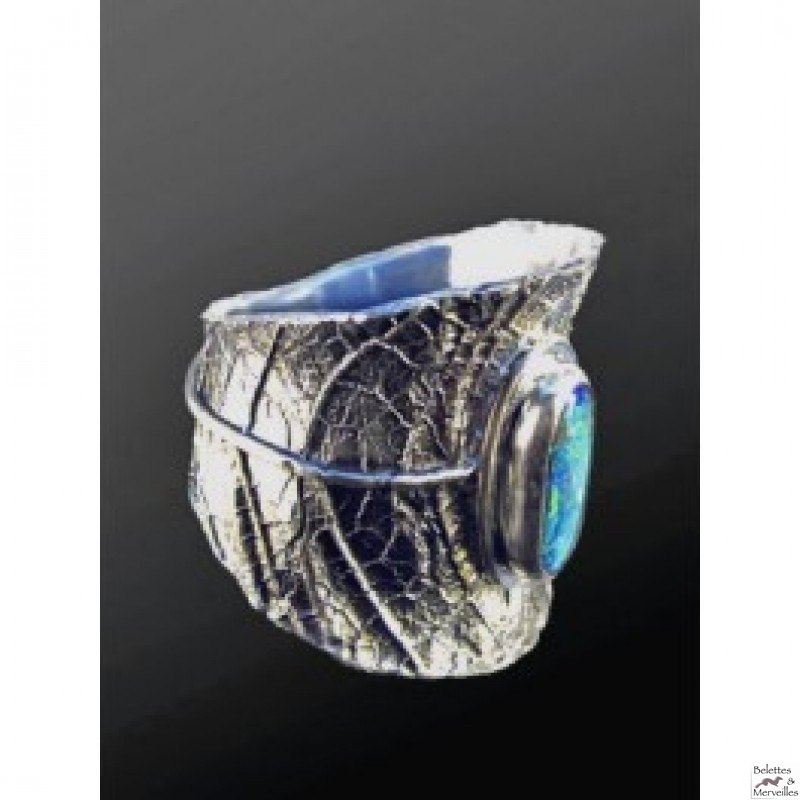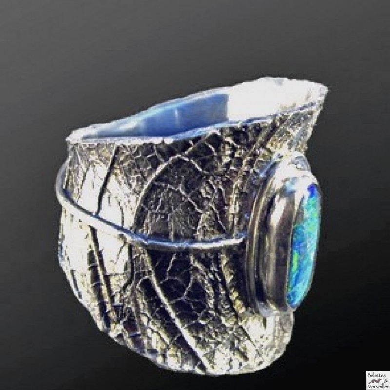 Tout droit sortie du Seigneur des Anneaux, la bague elfique porte une opale noire qui semble une fenêtre ouverte sur la Voie Lactée.