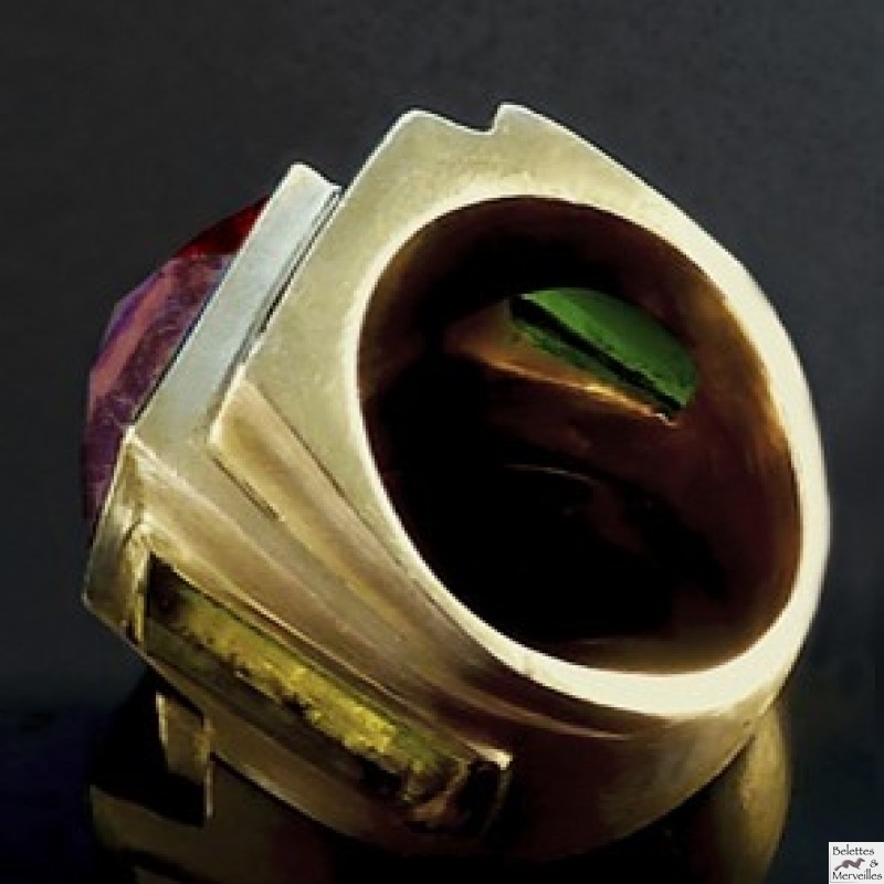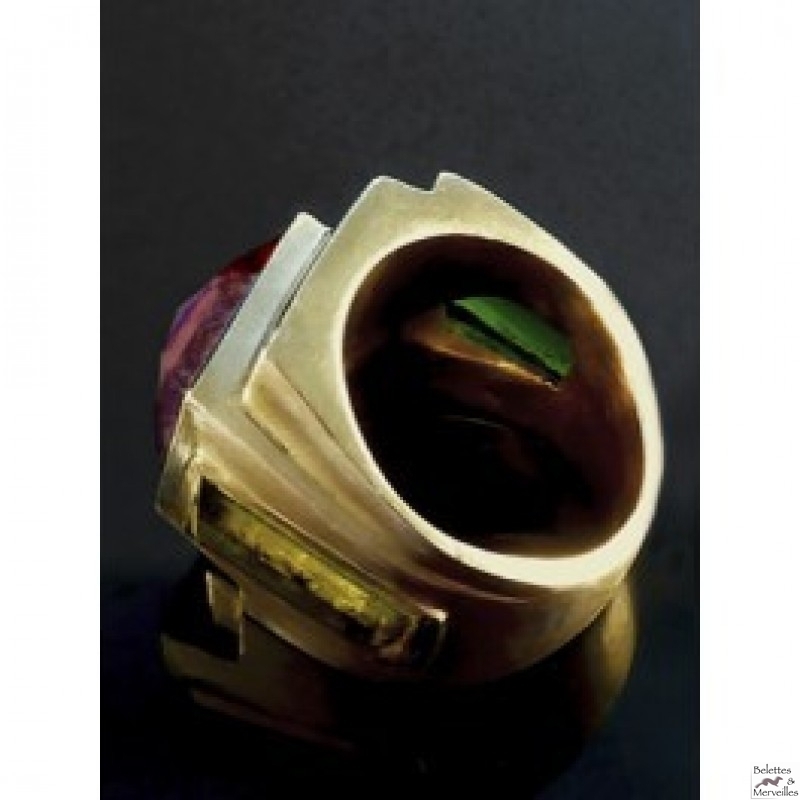 Bague en vermeil de taille 56. L"anneau du Roi des Aulnes est orné de trois tourmalines de taille baguette.