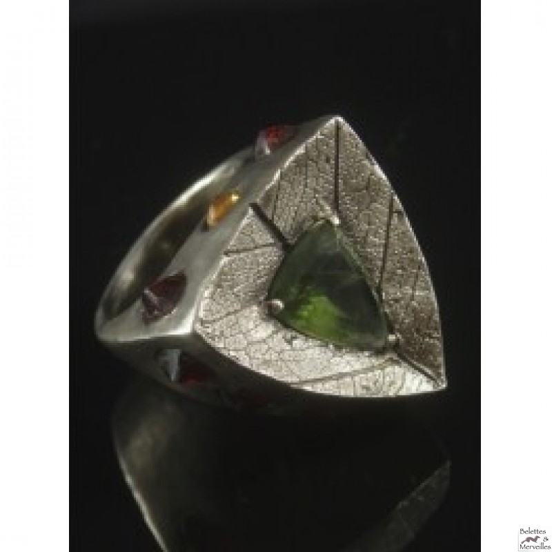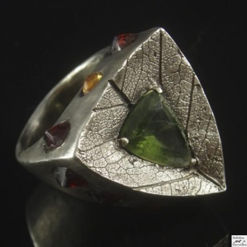 Chevalière de taille 56. Huit grenats almandins (1,76 ct), saphir (0,5 ct), péridot rutile (4,89 cts), 35 g d'argent.