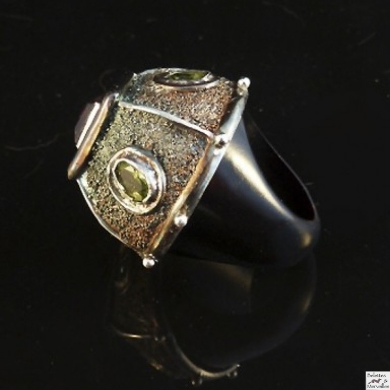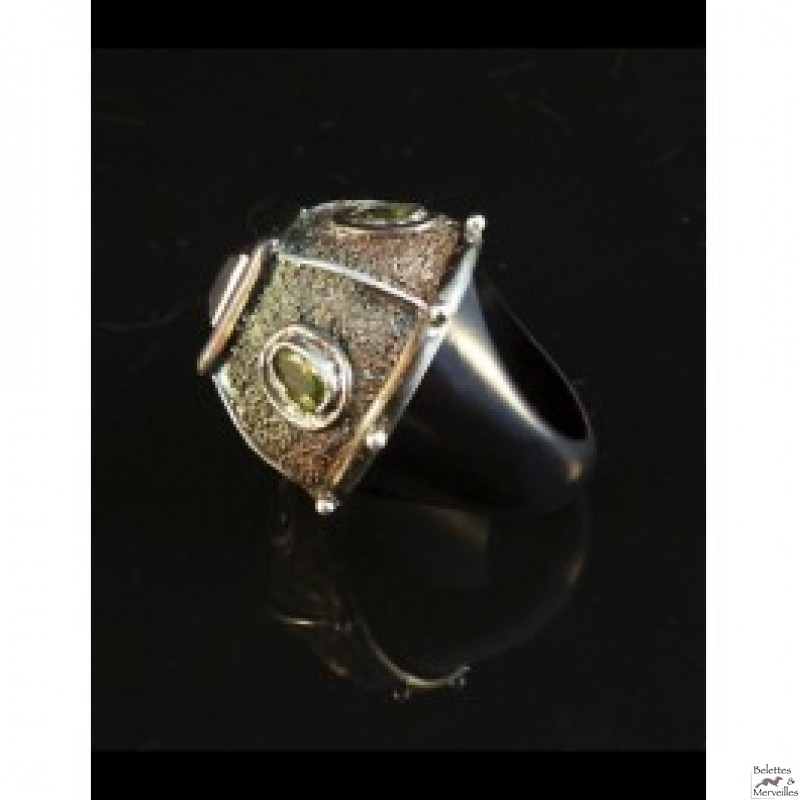 Bague d'ébène, argent, tourmaline et péridots. Taille 56.