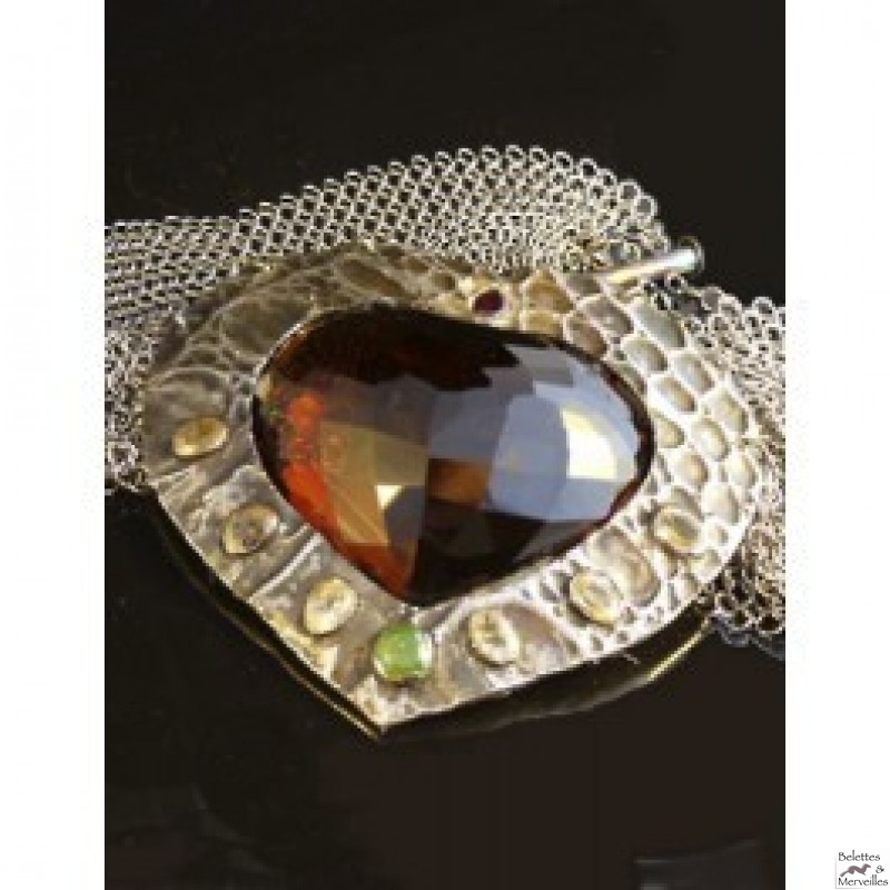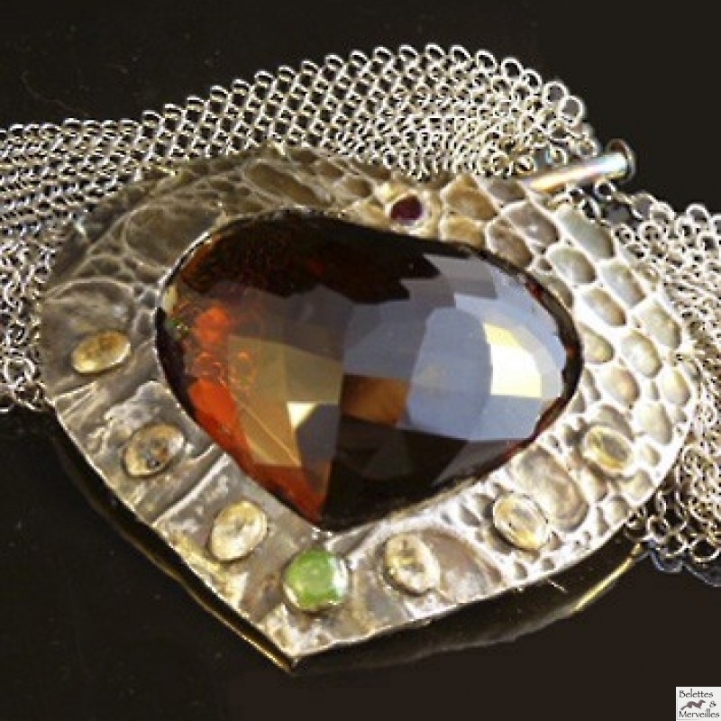 Le collier Coeur-de-Lionne est composé d'un rang de cotte de mailles d'acier et d'un pendentif d'argent serti d'une très grosse citrine madeira, de quartz rutiles et de grenats. Dimensions du collier : 3,5 x 50 cm, du pendentif : 8 x 7 cm.