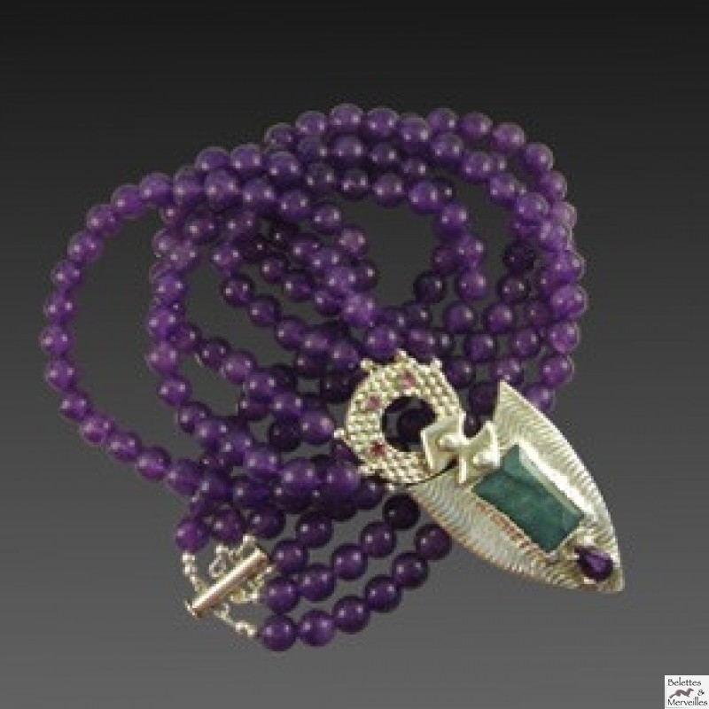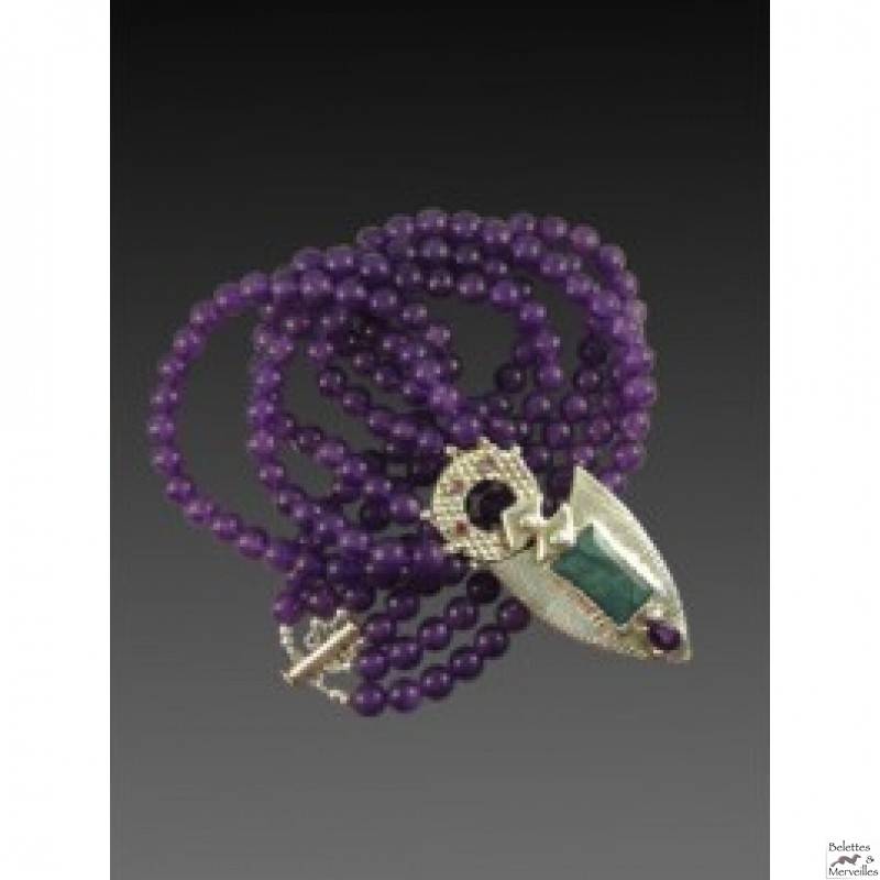 Collier avec pendentif de 3,5 x 7 cm. Longueur du collier 56 cm. Améthystes, émeraude et tourmalines.