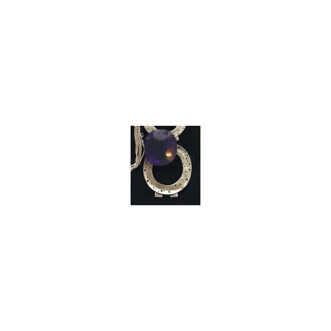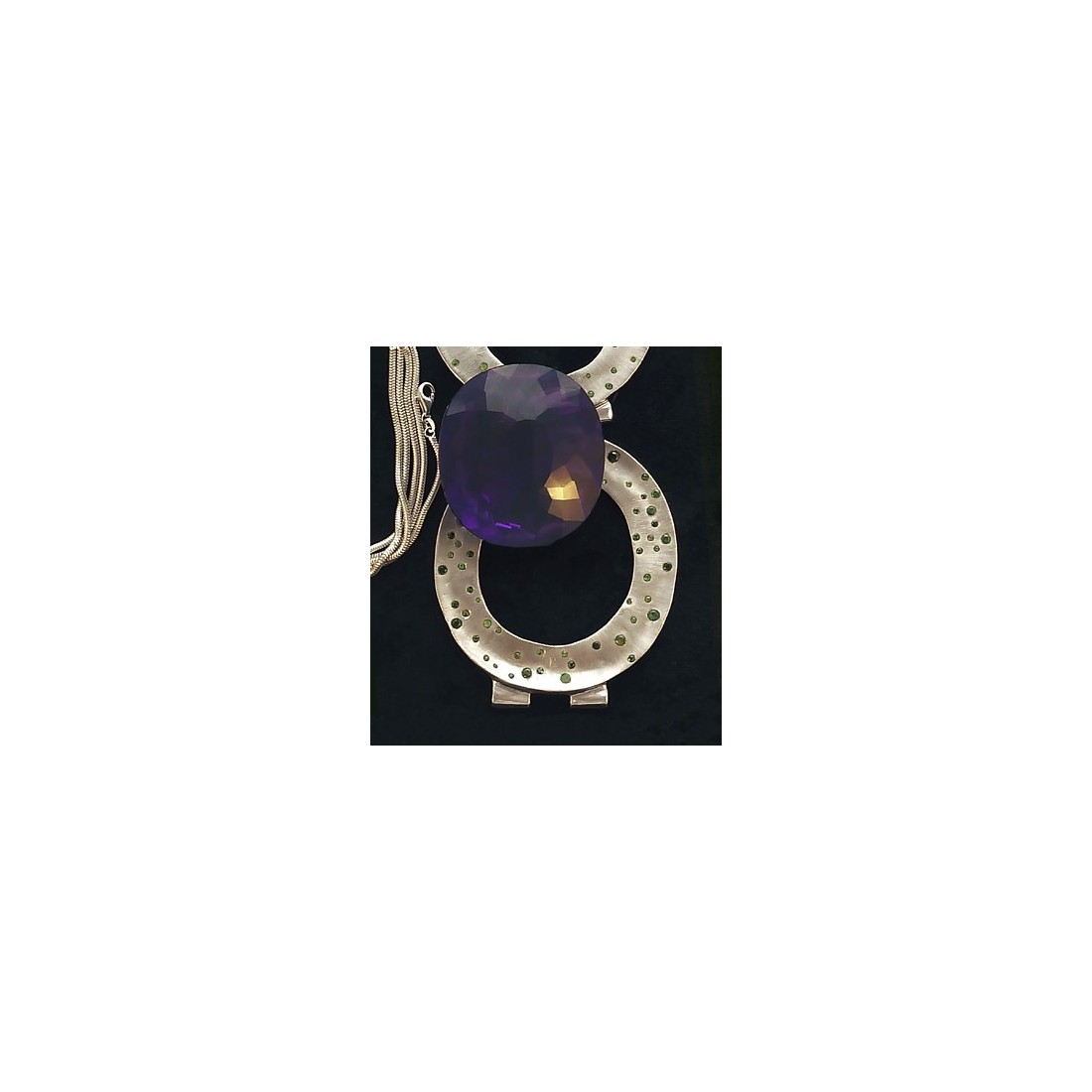 Collier avec pendentif de 6 sur 7 cm. Améthyste et grenats démantoïdes. La pierre peut être sortie de sa monture, pour le plaisir de tenir une très grosse gemme dans le creux de sa paume. Chaîne serpent de 60 cm incluse.