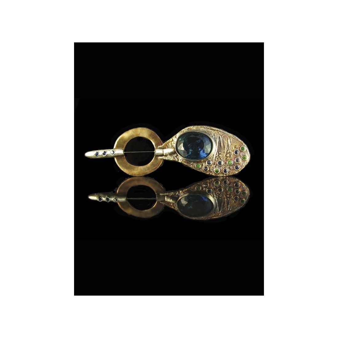 Broche-fibule, 11 cm x 3,5. Obsidienne, saphirs et grenats démantoïdes.